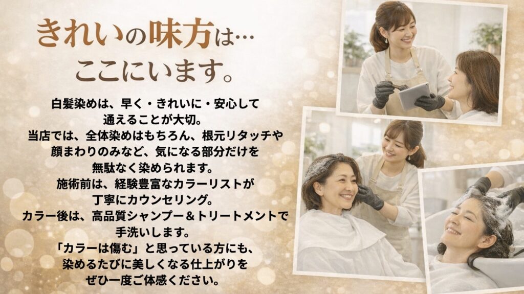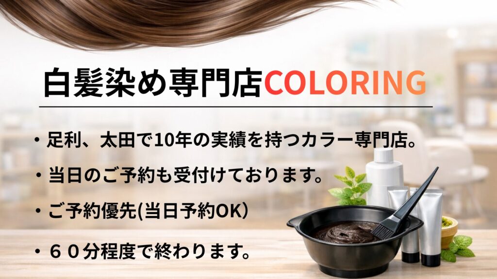 ※ブリーチ、ヘナ、マニキュアの取り扱いはございません。ポイントカラー(ハイライトやインナーカラー等)やブリーチを使用したハイトーンカラーは実施しておりません。
